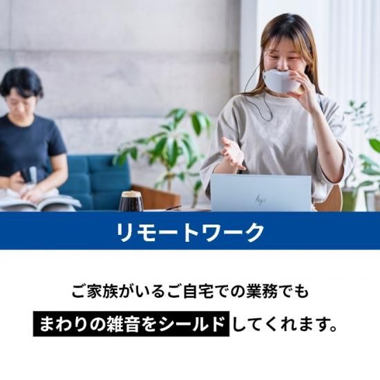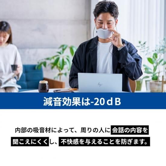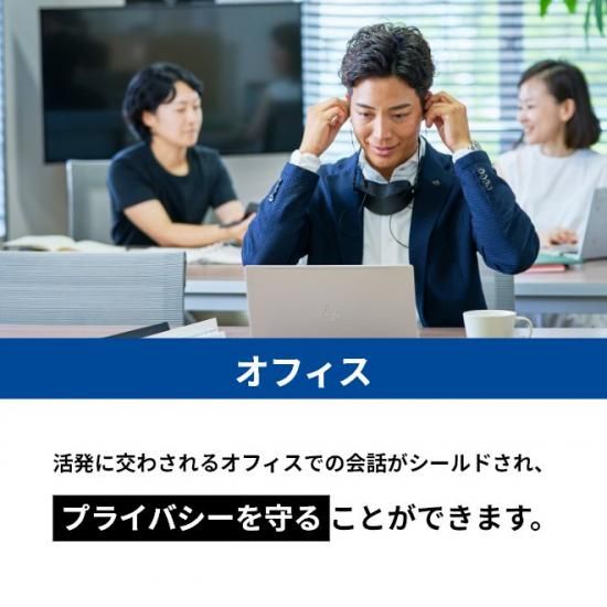 Web会議中シールドトークを装着することで自分の声を20dB減音。この減音効果により会話の情報漏洩を防ぐと同時に周囲への配慮ができます。また会議参加者には周囲の騒音を抑え、自分の声をクリアに届けられます。